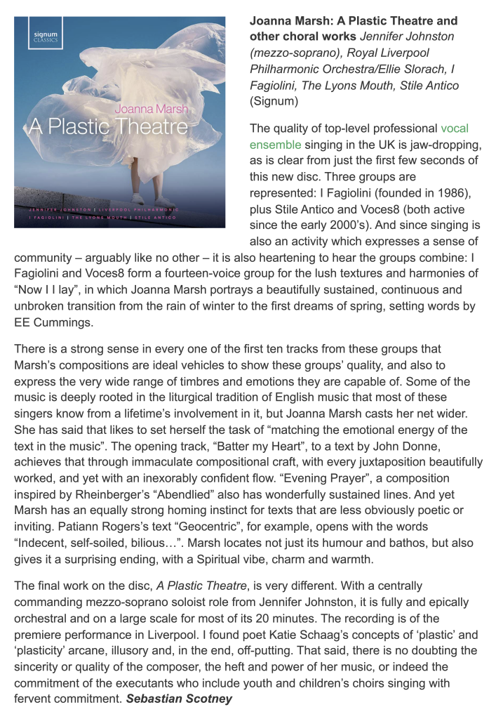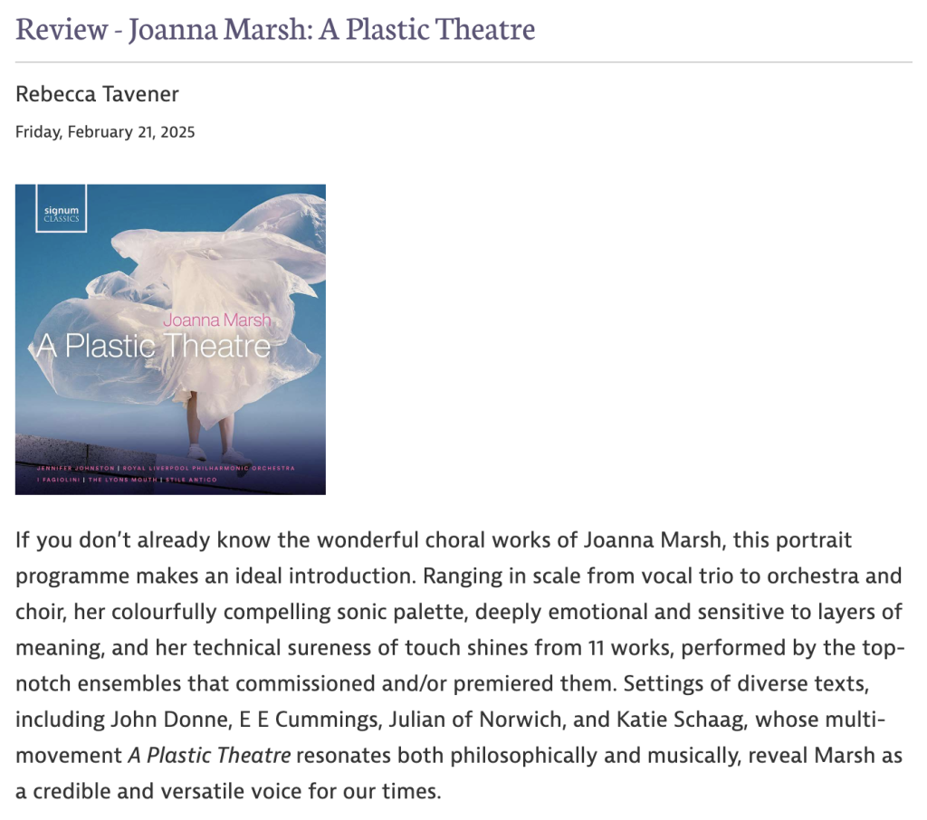The reviews are in for my most recent album, A Plastic Theatre! BBC Music Magazine awarded it four stars in their April 2025 edition, a full Arts Desk review was released in March 2025, and Gramophone Magazine released their review in February 2025, alongside a Video of the Day feature for In Winter’s House, performed by The Lyons Mouth from the album.