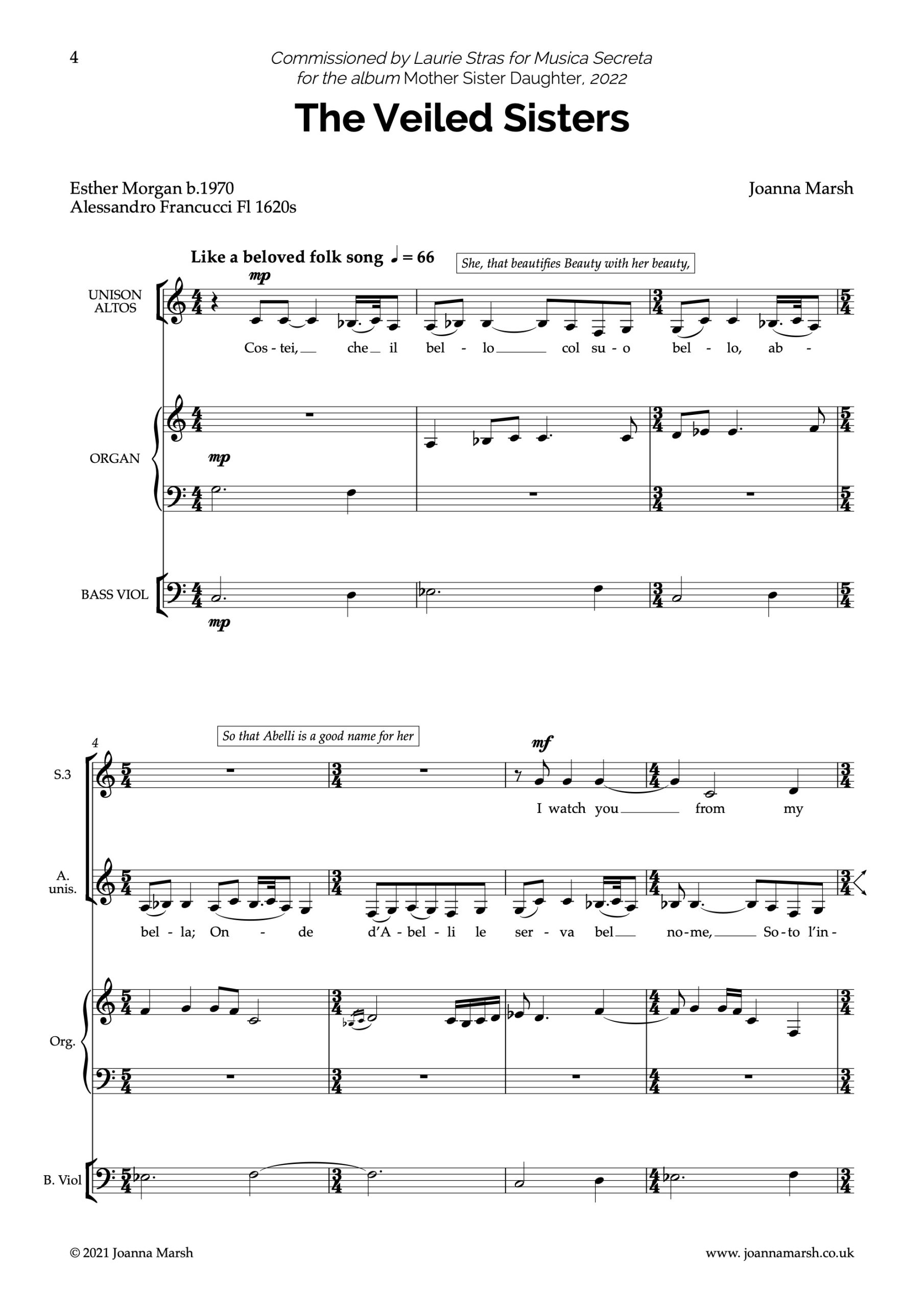 The Veiled Sisters was commissioned by Laurie Stras for Musica Secreta for their 2022 album ‘Mother, Sister, Daughter”. The first performance was given in Kings Place on 10th June 2022.